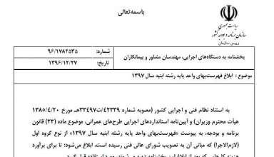 ابلاغ فهرست بهای واحد پایه رشته ابنیه سال 1397