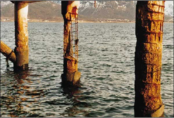 بیشترین نوع خوردگی در سازههای دریایی در نقاط حداکثر و حداقل ارتفاع موج اتفاق میافتد. این دو نقطه علاوه بر اینکه تواما در مجاورت آب و هوا قرار دارند، بیشترین نیروی وارده از طرف موج را نیز تحمل میکنند. همین مسئله میتواند موجب ایجاد بیشترین آثار خرابی و خوردگی در این نقاط شود. در صورتی که سکوی دریایی برای استخراج نفت یا گاز مورد استفاده قرار گیرد وجود گازهای آلاینده در فرایند استخراج و نمونهگیری نفت و گاز نیز موجب تشدید و تسریع فرایند خرابی میگردد. بطور کلی مواردی که پل های بتنی را بحرانی یا آسیب پذیر می کنند و سازه ها و پل های بتنی باید در برابر آن ها محافظت شوند؛ شامل :
