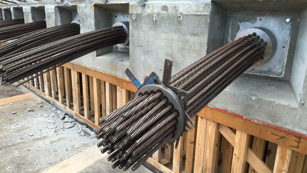 پس از نصب کابلها، آن ها به وسیله جک تحت کشش قرار میگیرند و سپس با استفاده از اجزای مهاری در محلشان ثابت میگردند. با اعمال تنش فشاری بر روی اعضای سازه، تنش کششی عضو بتنی ممکن است تحت بارگذاری خنثی شود.